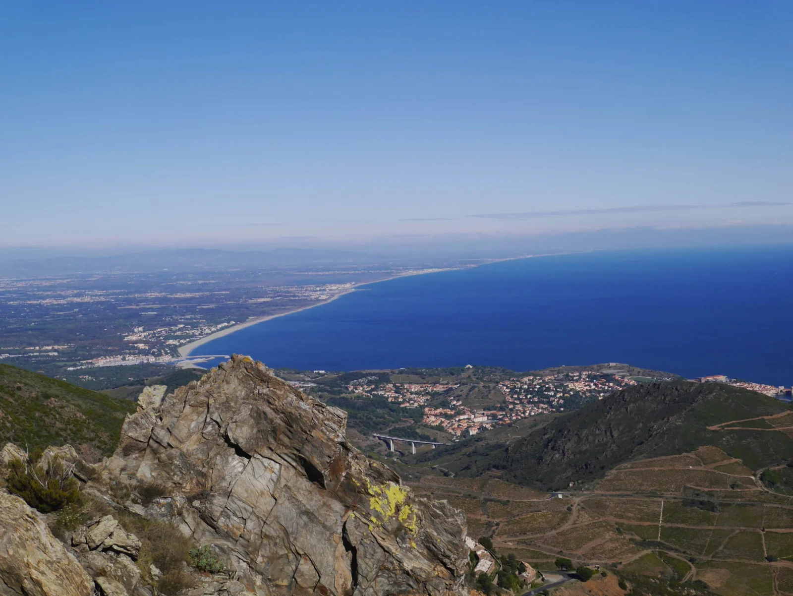 Vous traverserez le magnifique vignoble de Banyuls-sur-Mer avec ses murets de pierres sèches et son impressionnant dispositif d’évacuation des eaux pluviales. Par un chemin rocailleux et entrecoupé d’éboulis vous arriverez au Col de la Rumpissa (538 m). Borne frontière n° 597. Après une ascension vous arrivez au Carroig (670 m). Un panorama unique se déroule sous vos yeux, du Canigou lointain qui déchire l’azur au Cap Creu qui plonge dans la mer. Ensuite descente vers la typique localité espagnole de Port Bou, marquée par l’histoire des chemins de fer. Vous empruntez le train direction Llança (10 minutes, 2€ environ).